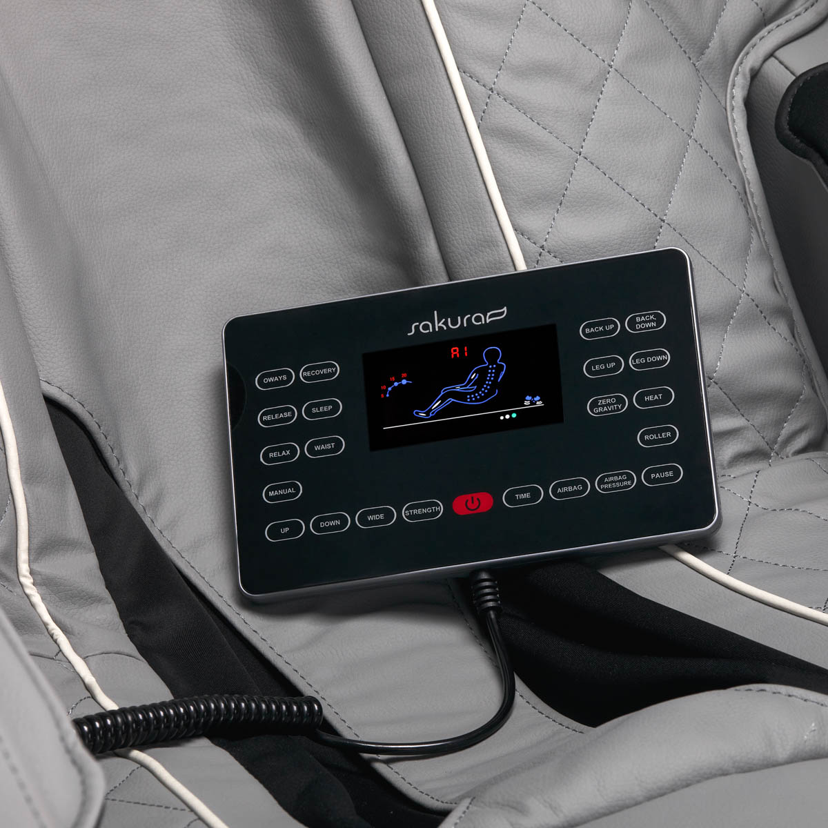 Das übersichtliche Bedienfeld, das wir am Griff am rechten Armlehne anbringen oder in den Händen halten können, macht die Nutzung des Stuhls einfach und angenehm. Auf dem gut lesbaren Bildschirm können wir den aktuellen Fortschritt des Geräts verfolgen. Es zeigt deutlich an, welche Körperbereiche gerade massiert werden, die Intensität, die Dauer der Behandlung und das ausgewählte Programm. Das Bedienfeld ermöglicht es, die Einstellungen des Stuhls und der Massagefunktionen frei anzupassen sowie die Behandlungsdauer festzulegen, die 5, 10, 15, 20, 25 oder 30 Minuten betragen kann. Die Massageintensität der Köpfe und Luftkissen kann leicht in 5 Stufen angepasst werden.