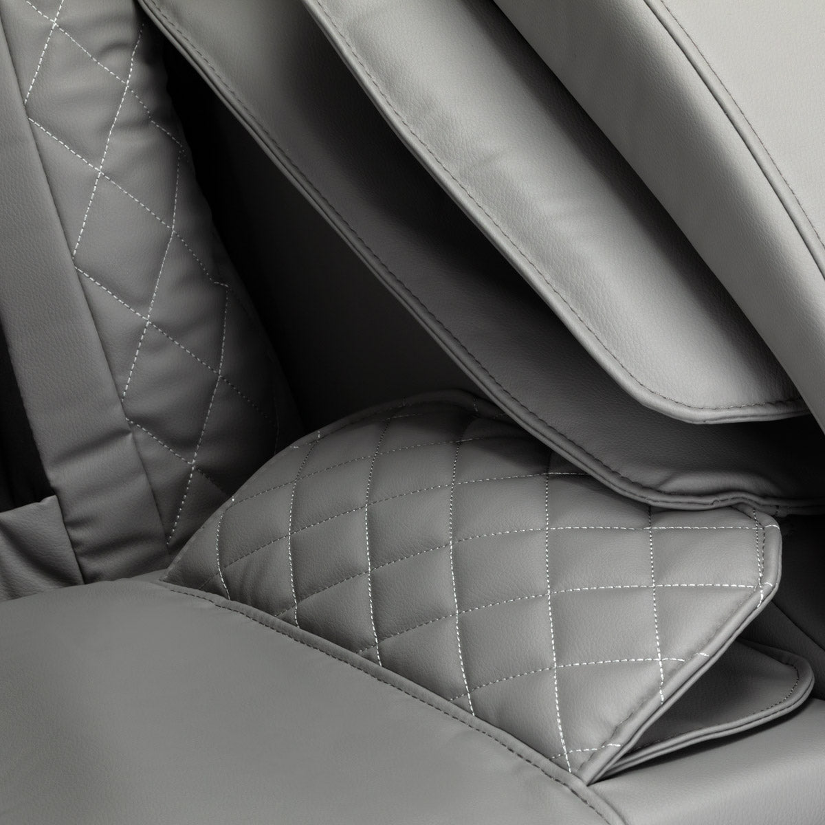 Die ergonomische Form des Stuhls bietet eine ausreichende Unterstützung für Rücken, Nacken und Beine. Das komfortable Innere des Stuhls ist mit einem angenehm anzufassenden Lederimitat in Grautönen bezogen, und die Mitte ist mit bequemem, strapazierfähigem Schaumstoff gefüllt, der einen hohen Nutzungskomfort gewährleistet. Die Verwendung solcher Materialien macht die Geräte langlebig, feuchtigkeitsbeständig und leicht zu reinigen. Sorgfältig verarbeitete Säume verleihen ihm einen stilvollen Look, und die solide Konstruktion garantiert eine lange Nutzung. Ein Modell mit ästhetischem Finish und klassischen Farben passt perfekt in jedes Interieur. Der Sakura Standard 801 Massagesessel ist eine großartige Möglichkeit, sich jederzeit zu entspannen, besonders nach einem anstrengenden Tag oder einem harten Training.