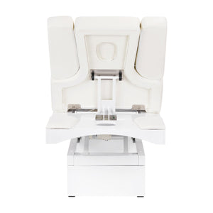 Eine neue Kosmetikliege. Die Spa-Kosmetikliege Azzurro A314S ist zweifellos ein Bestseller unter Kosmetikliegen. Die Kosmetikliege verfügt über eine elektrisch verstellbare Höhe in einem sehr breiten Bereich (62-90 cm). Die Rückenlehne ist ebenfalls mit Fernsteuerung zu verstellen, von horizontaler Position fast bis zur vertikalen Position (bis 80 Grad). In der Rückenlehne befinden sich zwei Ausschnitte mit wechselbaren Abdeckelementen (Element zur völligen Abdeckung + Element für Gesichtsausschnitt). Es besteht die Möglichkeit, die Seitenteile der Rückenlehne zur Seite herauszuziehen oder völlig zu demontieren. Unter der Rückenlehne befindet sich die Schublade für Hand-Zubehör. Die Liege ist sehr breit (76 cm) und verfügt über eine dicke und sehr bequeme Matratze. Die Liege ist sehr stabil. Die Kosmetikliege ist mit einem hochwertigen Ökoleder mit sanftem Ecru-Farbton gepolstert. Das Möbelstück ist in schönem Wenge erhältlich.
